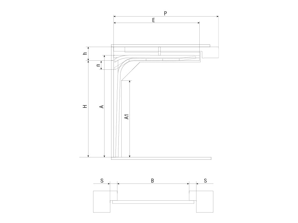 Усл. обозначение, наименование параметра Расчетная формула H, мм Высота проема H h, мм Высота притолоки h ≥ 100; (h ≥ 130 при использовании потолочного привода) B, мм Ширина проема B A, мм Высота угловой стойки H + 54 A1, мм Высота вертикальной направляющей А - 552 E, мм Длина горизонтальных направляющих Н + 440 S, мм Минимальное боковое пространство 100 P, мм Зона расположения потолочного привода Н + 1 185 n, мм Перекрытие проема в открытом положении 230 (без привода); 40–60 (с потолочным приводом)