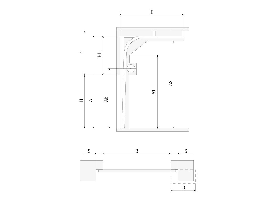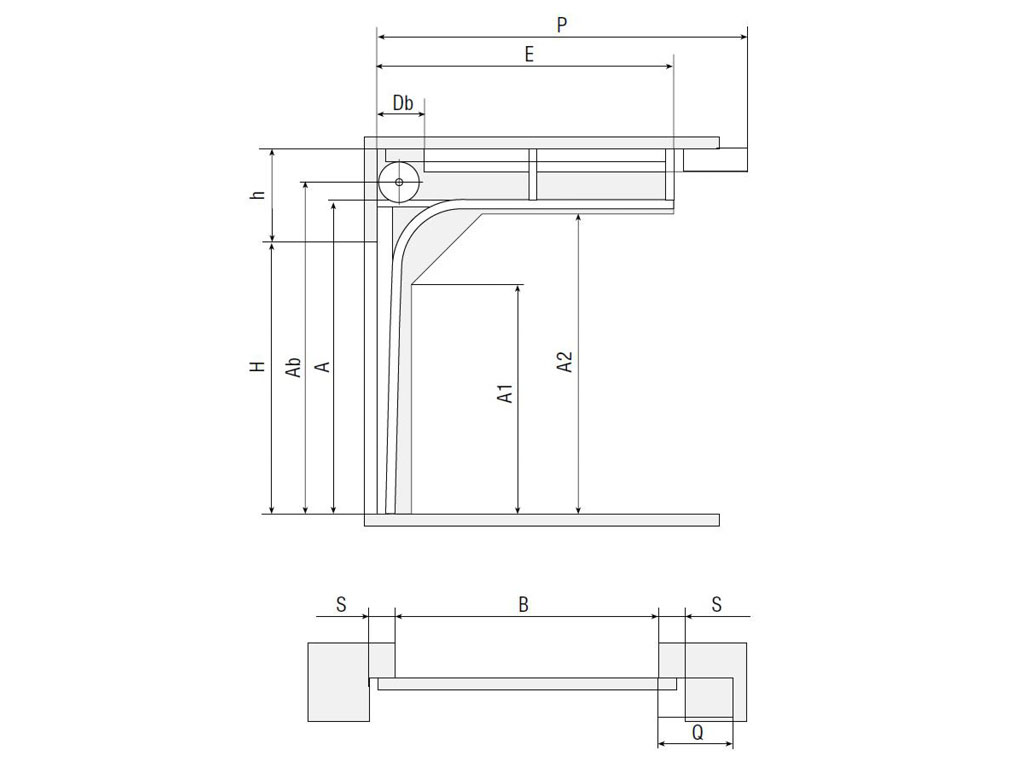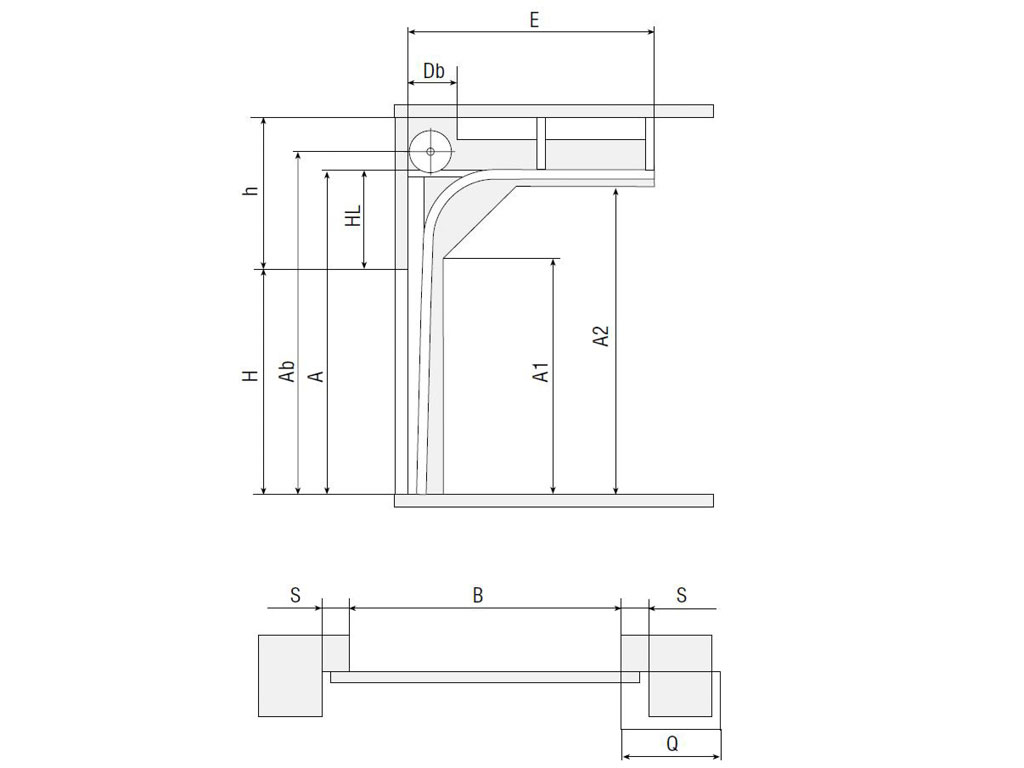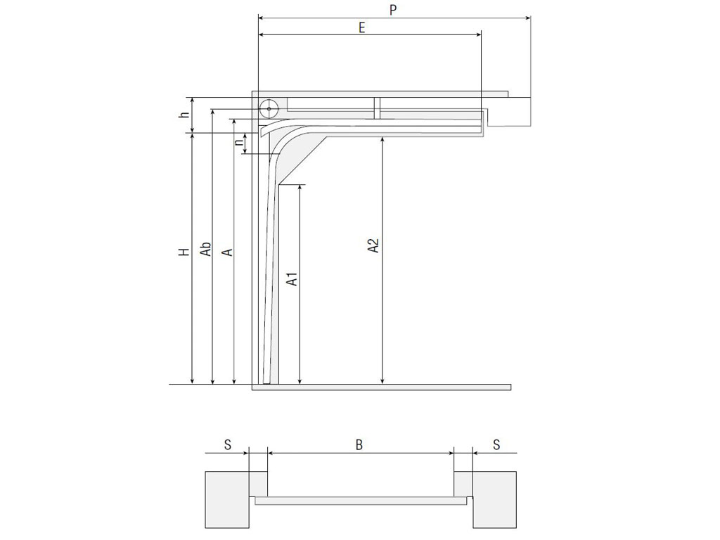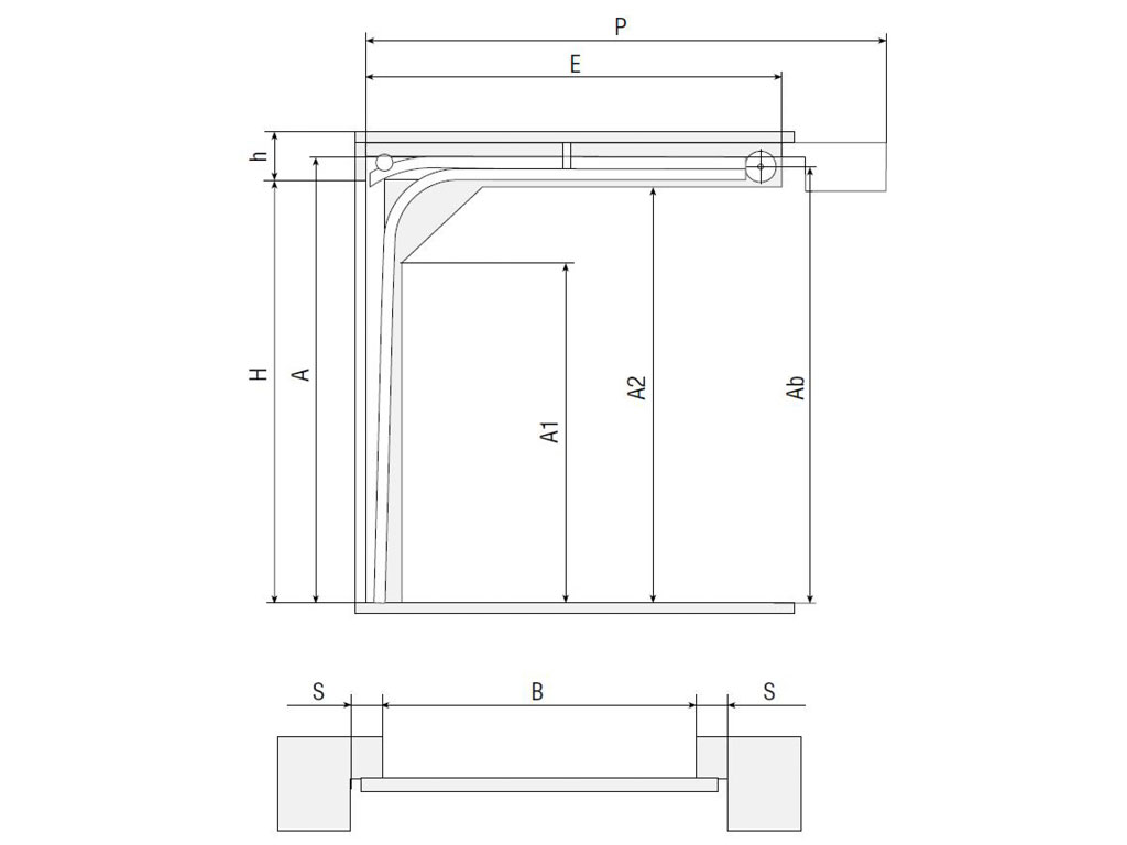 ≥ 280 (с вальным приводом, при H < 3 700)B, мм Ширина проема B A, мм Высота угловой стойки H + 110 Ab, мм Высота оси вала и барабана ≥ A + 59 A1, мм Высота вертикальной направляющей А - 543 A2, мм Высота горизонтальной направляющей А - 106 E, мм Длина горизонтальных направляющих Н + 340 Db, мм Рабочая зона торсионного механизма Зависит от размеров проема и веса щита S, мм Минимальное боковое пространство 120 (150 с опцией «обогреваемый контур») n, мм Перекрытие проема в открытом положении 190 (без привода);
