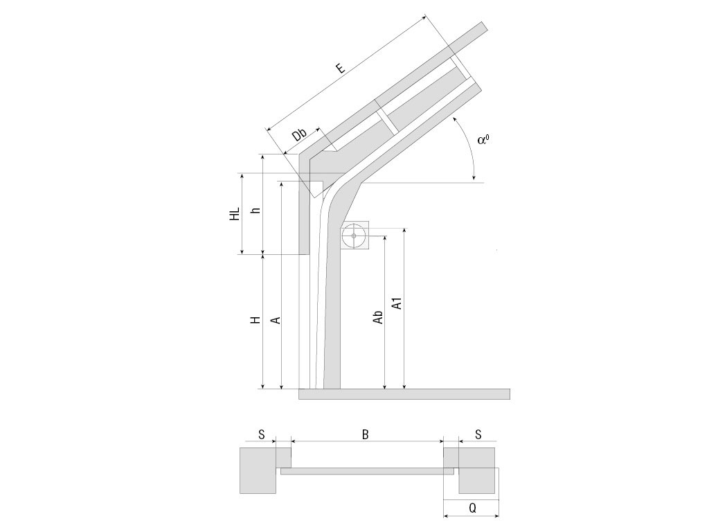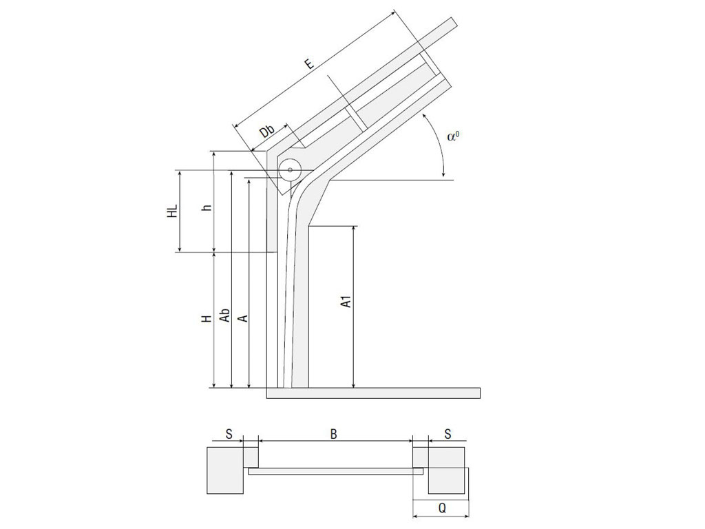 40...60 (с приводом)Усл. обозначение, наименование параметра Расчетная формула H, мм Высота проема H h, мм Высота притолоки > 500 B, мм Ширина проема B A, мм Высота угловой стойки H + 250…985 Ab, мм Высота оси вала и барабана А + 86/97 A1, мм Высота вертикальной направляющей Н - 300 E, мм Длина горизонтальных направляющих Зависит от угла α° (размер, ограничивающий рабочую зону ворот вглубь помещения) Db, мм Рабочая зона торсионного механизма Зависит от размеров проема и веса щита S, мм Минимальное боковое пространство 120 (150 с опцией «обогреваемый контур») α° Угол наклона направляющих к горизонтали 5...65 (кратен 5°) Q, мм Зона расположения привода на вал 300 Усл. обозначение, наименование параметра Расчетная формула H, мм Высота проема H h, мм Высота притолоки ≥ 660 B, мм Ширина проема B HL, мм Расстояние от уровня горизонтальных направляющих до проема По умолчанию h - 330 A, мм Высота угловой стойки H + HL Ab, мм Высота оси вала и барабана A + 86/97 A1, мм Высота вертикальной направляющей А - 580 A2, мм Высота горизонтальной направляющей А - 53 E, мм Длина горизонтальных направляющих H - НL + 510...640 Db, мм Рабочая зона торсионного механизма Зависит от размеров проема и веса щита S, мм Минимальное боковое пространство 120 (150 с опцией «обогреваемый контур») Q, мм Зона расположения привода на вал 300 Усл. обозначение, наименование параметра Расчетная формула H, мм Высота проема H h, мм Высота притолоки ≥1 600 B, мм Ширина проема B HL, мм Расстояние от уровня горизонтальных направляющих до проема 1 330 ≤ HL ≤ h - 150 A, мм Высота угловой стойки H + HL Ab, мм Высота оси вала и барабана H + 400...600 + 280 A1, мм Высота вертикальной направляющей А - 580 A2, мм Высота горизонтальной направляющей А - 53 E, мм Длина горизонтальных направляющих H - НL + 510...640 Db, мм Рабочая зона торсионного механизма Зависит от размеров проема и веса щита S, мм Минимальное боковое пространство ≥ 300 Q, мм Зона расположения привода на вал ≥ 500 Усл. обозначение, наименование параметра Расчетная формула H, мм Высота проема H h, мм Высота притолоки ≥ 660 B, мм Ширина проема B HL, мм Расстояние от уровня горизонтальных направляющих до проема 330 A, мм Высота угловой стойки H + HL + 15...749 Ab, мм Высота оси вала и барабана ≤ А + 86/97 A1, мм Высота вертикальной направляющей Н + HL - 330...580 E, мм Длина горизонтальных направляющих Зависит от угла α° (размер, ограничивающий рабочую зону ворот вглубь помещения) Db, мм Рабочая зона торсионного механизма Зависит от размеров проема и веса щита S, мм Минимальное боковое пространство 120 (150 с опцией «обогреваемый контур») α° Угол наклона направляющих к горизонтали 5...65 (кратен 5°) Q, мм Зона расположения привода на вал 300 Усл. обозначение, наименование параметра Расчетная формула H, мм Высота проема H h, мм Высота притолоки ≥ 1 600 B, мм Ширина проема B HL, мм Расстояние от уровня горизонтальных направляющих до проема ≥ 1 330 A, мм Высота угловой стойки H + HL + 15...749 Ab, мм Высота оси вала и барабана > H + 680 A1, мм Высота вертикальной направляющей Н + HL - 330...580 E, мм Длина горизонтальных направляющих Зависит от угла α° (размер, ограничивающий рабочую зону ворот вглубь помещения) Db, мм Рабочая зона торсионного механизма Зависит от размеров проема и веса щита S, мм Минимальное боковое пространство 120 (150 с опцией «обогреваемый контур») α° Угол наклона направляющих к горизонтали 5...65 (кратен 5°) Q, мм Зона расположения привода на вал ≥ 650 Усл. обозначение, наименование параметра Расчетная формула 