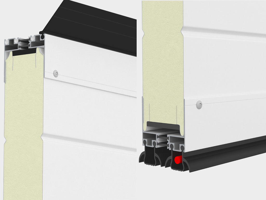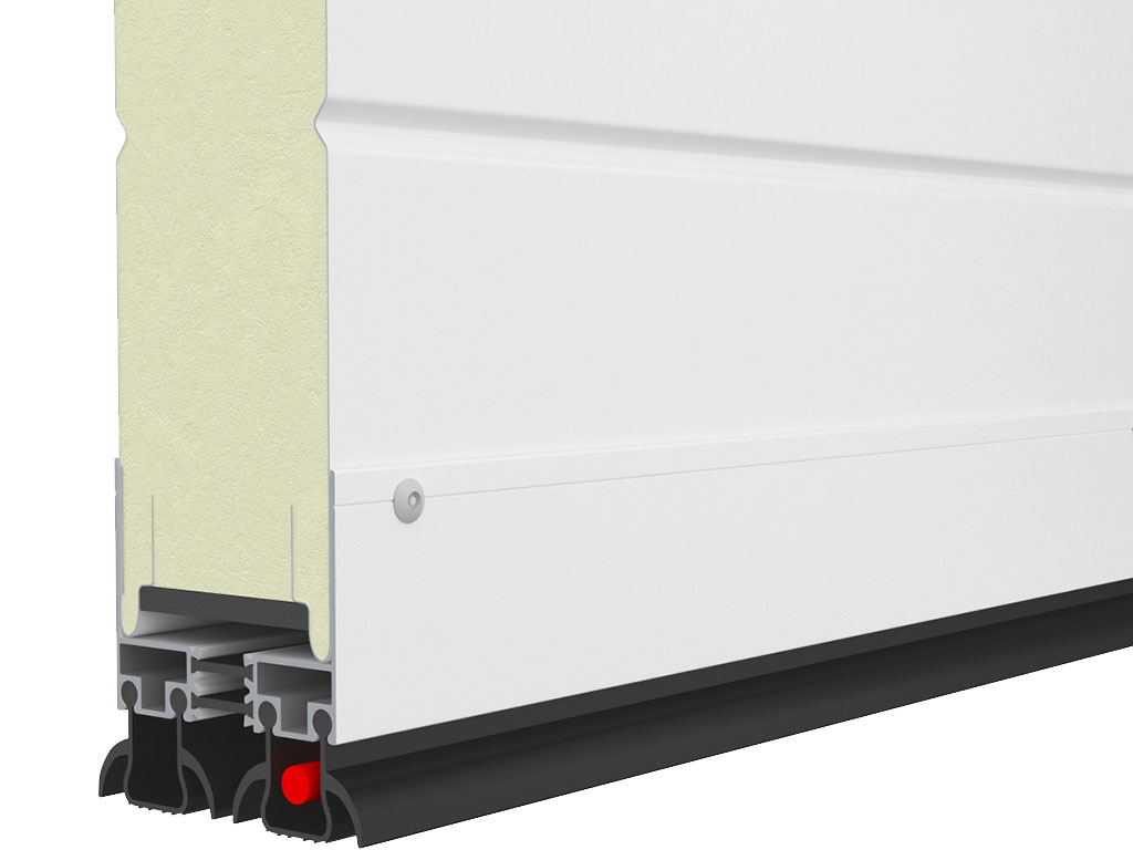 Полотно из сэндвич-панели толщиной 80 мм с пенополиуретановым наполнителем высокой плотности. Листы панели термически разделены вставкой энергофлексового уплотнителя, который препятствует промерзанию стыка панелей.Верхний алюминиевый профиль с терморазделением препятствует образованию конденсата и наледи в верхней части полотна ворот. Верхний уплотнитель сохраняет свою эластичность при отрицательных температурах и обеспечивает надежную герметизацию проема.Нижний алюминиевый профиль сохраняет терморазделение сэндвич-панели. Двойной уплотнитель нивелирует неровности пола, обеспечивает хорошую герметизацию. Греющий провод устанавливается в нижний уплотнитель при выборе опции «обогреваемый контур проема».Двойная система уплотнения проема: боковой двухлепестковый уплотнитель установлен между полотном и угловой стойкой, внешний двухлепестковый контур уплотнения — между проемом и щитом. Проем уплотняется четырьмя уплотнителями одновременно, дополнительные воздушные камеры обеспечивают максимально надежную герметизацию.Системы направляющих из стали толщиной 2 мм — надежное решение, обладающее повышенным запасом прочности.Пружинный механизм на торсионных пружинах, рассчитанный на 25 000 циклов, обеспечивает долговечность конструкции ворот.Устройство защиты от обрыва троса устанавливается в качестве нижнего кронштейна на полотно ворот. В случае обрыва троса механизм срабатывает и предотвращает падение полотна ворот.Дополнительная комплектация