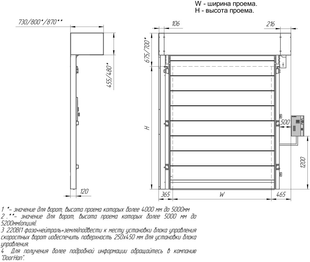 Усл. обозначение, наименование параметра Расчетная формула B, мм Ширина проема 1 400–3 370 H, мм Высота проема 1 800–5 000 (опция — 5 200)