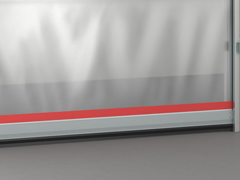 Полотно – непрозрачный армированный ПВХ плотностью 900–1 200 г/м² с алюминиевыми разделяющими профилями.Блок управления с частотным преобразователем в стальном окрашенном корпусе, 300 × 400 × 150 мм; класс защиты – IP54.Фотоэлементы устанавливаются на высоте 500 мм от пола, а также в верхних точках боковых стоек для выявления некорректной размотки полотна при открывании.Дополнительная комплектация