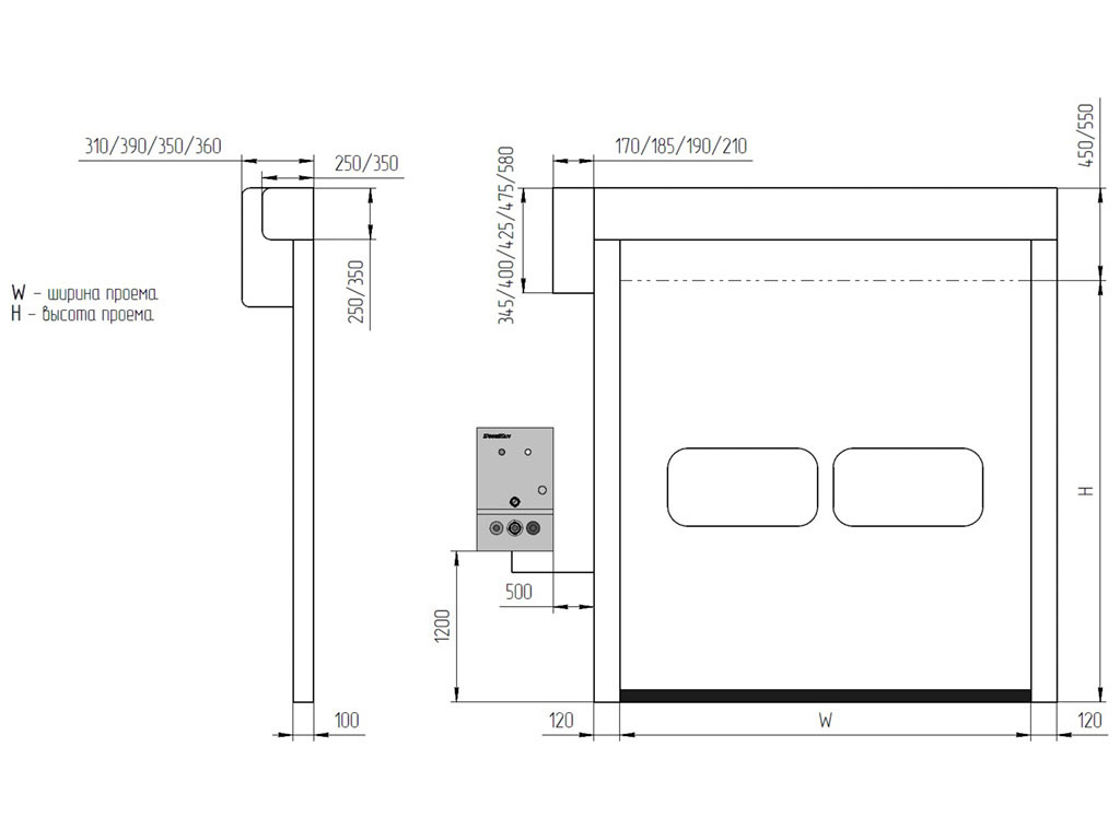 Блок управления с частотным преобразователем в стальном окрашенном корпусе, 300 × 400 × 150 мм; класс защиты – IP54.Фотоэлементы устанавливаются на высоте 500 мм от пола, а также в верхних точках боковых стоек для выявления некорректной размотки полотна при открывании.Дополнительная комплектация